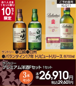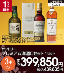 ・対象商品:白州・響含むウイスキー3本セット(サントリーシングルモルトウイスキー白州 Story of the Distillery2025、サントリーウイスキー響 BLOSSOM HARMONY2025、アランモルト 10年)